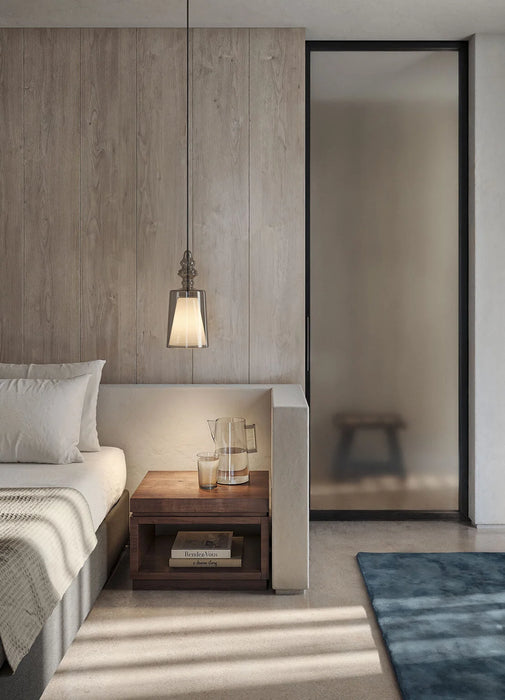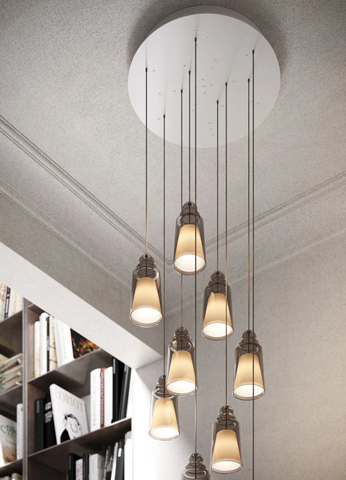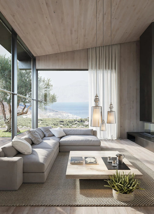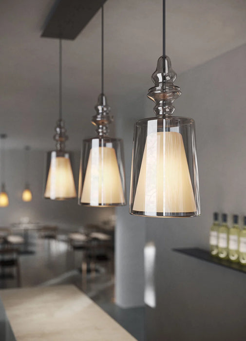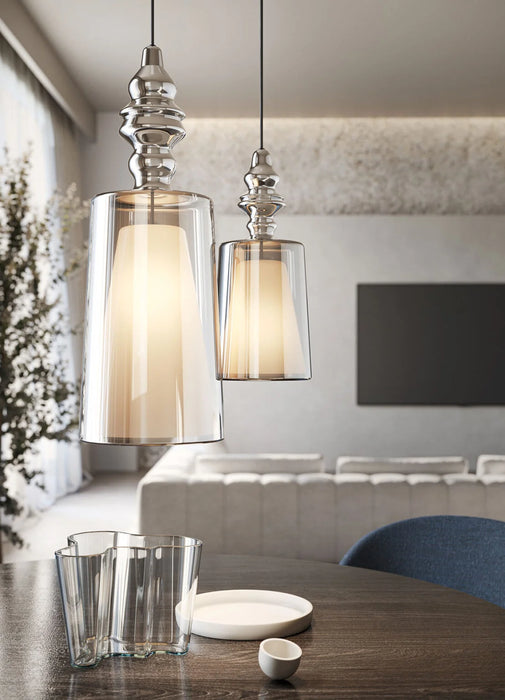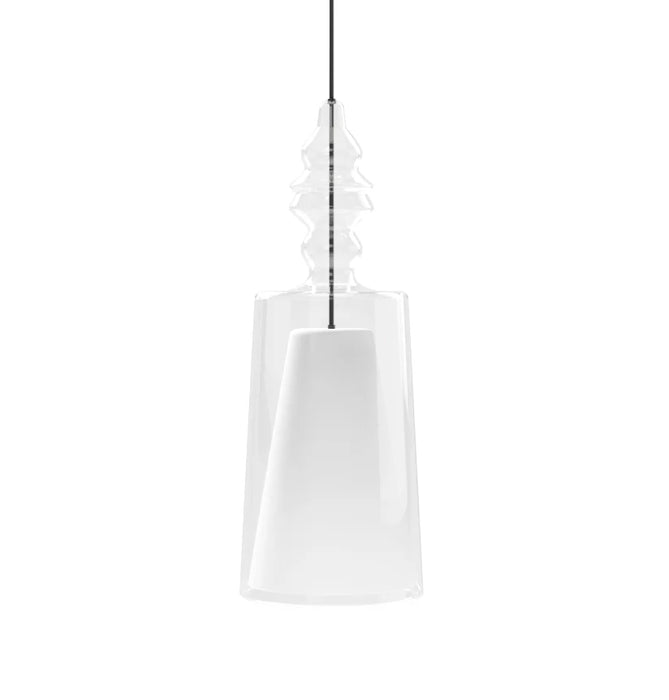 Alìbabà, lampada iconica per Karman, viene rivisitata dal designer Matteo Ugolini in vetro borosilicato, che ne esalta le trasparenze e i riflessi.