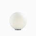 Lampada da tavolo e terra con montatura in metallo con finitura nickel satinato. Diffusore a sfera in vetro bianco soffiato e acidato.